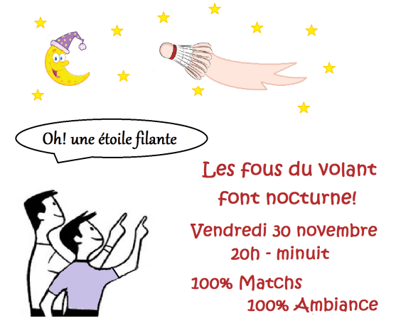 Nouvelle saison, nouvelle formule, notre traditionnel tournoi interne fait peau neuve et passe en nocturne! Vendredi 30 novembre, 20h – minuit, en remplacement de l’entrainement et jeu libre habituels . Une doodle d’inscription suivra très bientôt pour tous les adhérents